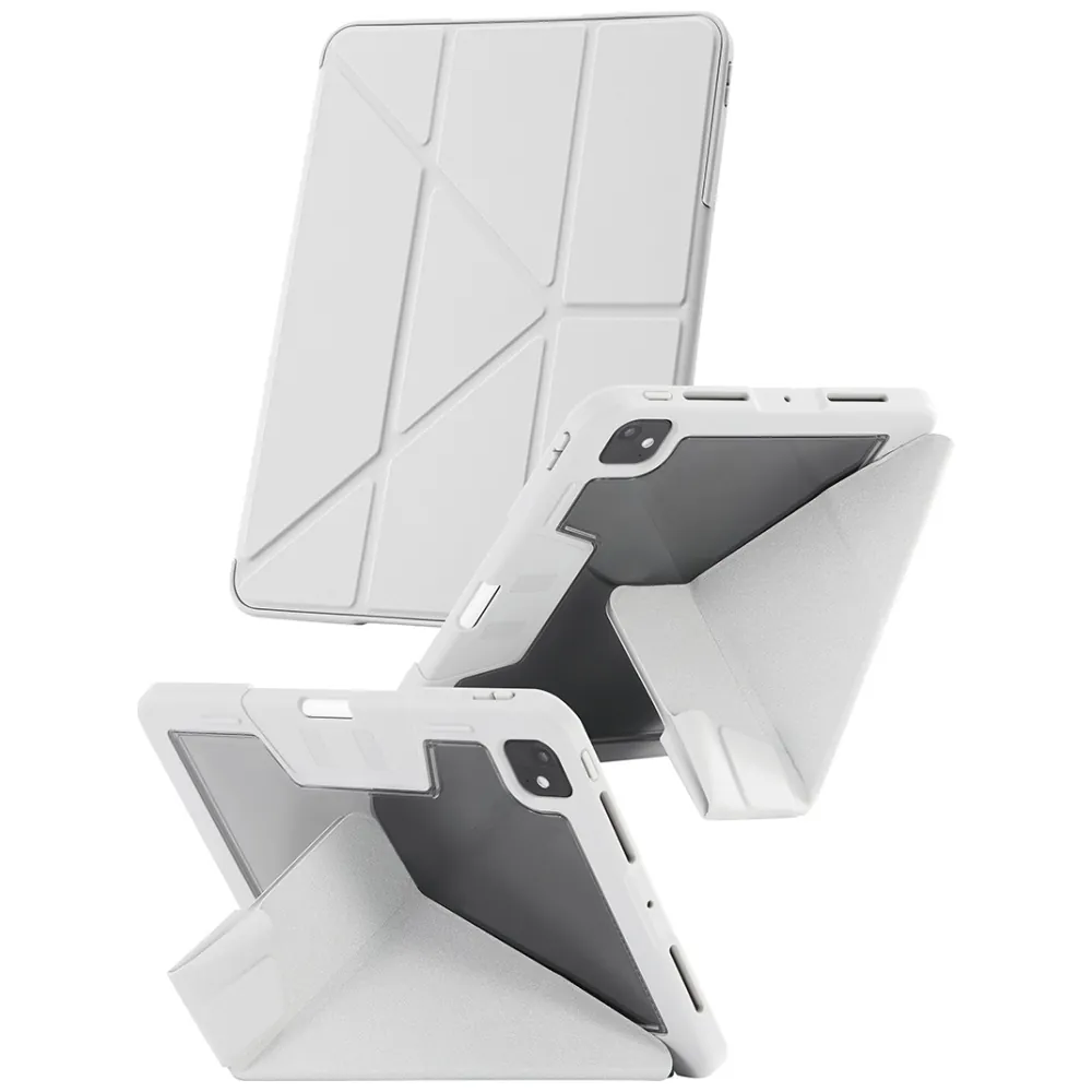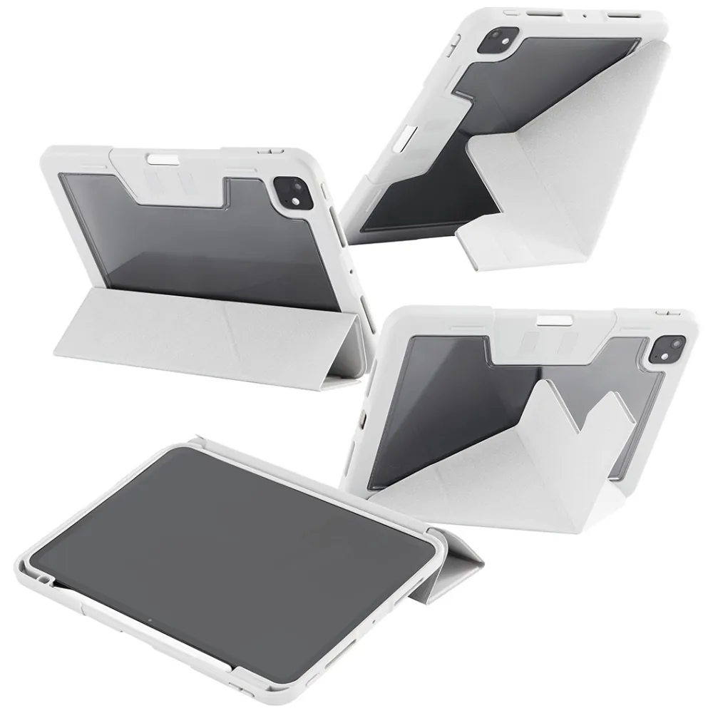 Wzmocnione narożniki etui skutecznie amortyzują uderzenia, chroniąc iPada z każdej strony. Materiały pochodzące z recyklingu, takie jak PC, TPU i 35% PU, tworzą trwałą, a jednocześnie elegancką powierzchnię. Ponadto jasnoszary kolor z przezroczystymi pleckami dodaje nowoczesnego charakteru. To ochrona, która nie tylko działa, ale też zachwyca.
