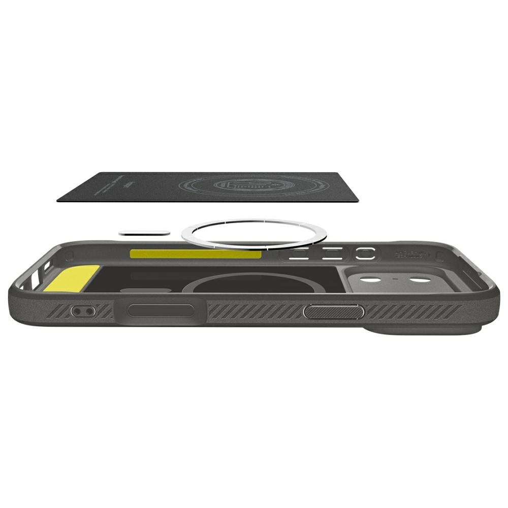 Etui Spigen Rugged Armor Mag chroni zarówno tył, jak i boki urządzenia. Podniesione krawędzie wokół ekranu i aparatu zabezpieczają przed zarysowaniami, co dodaje pewności podczas użytkowania. Matowa faktura minimalizuje ślady odcisków palców, dzięki czemu telefon zawsze wygląda czysto. To bezpieczeństwo, które nie rzuca się w oczy.